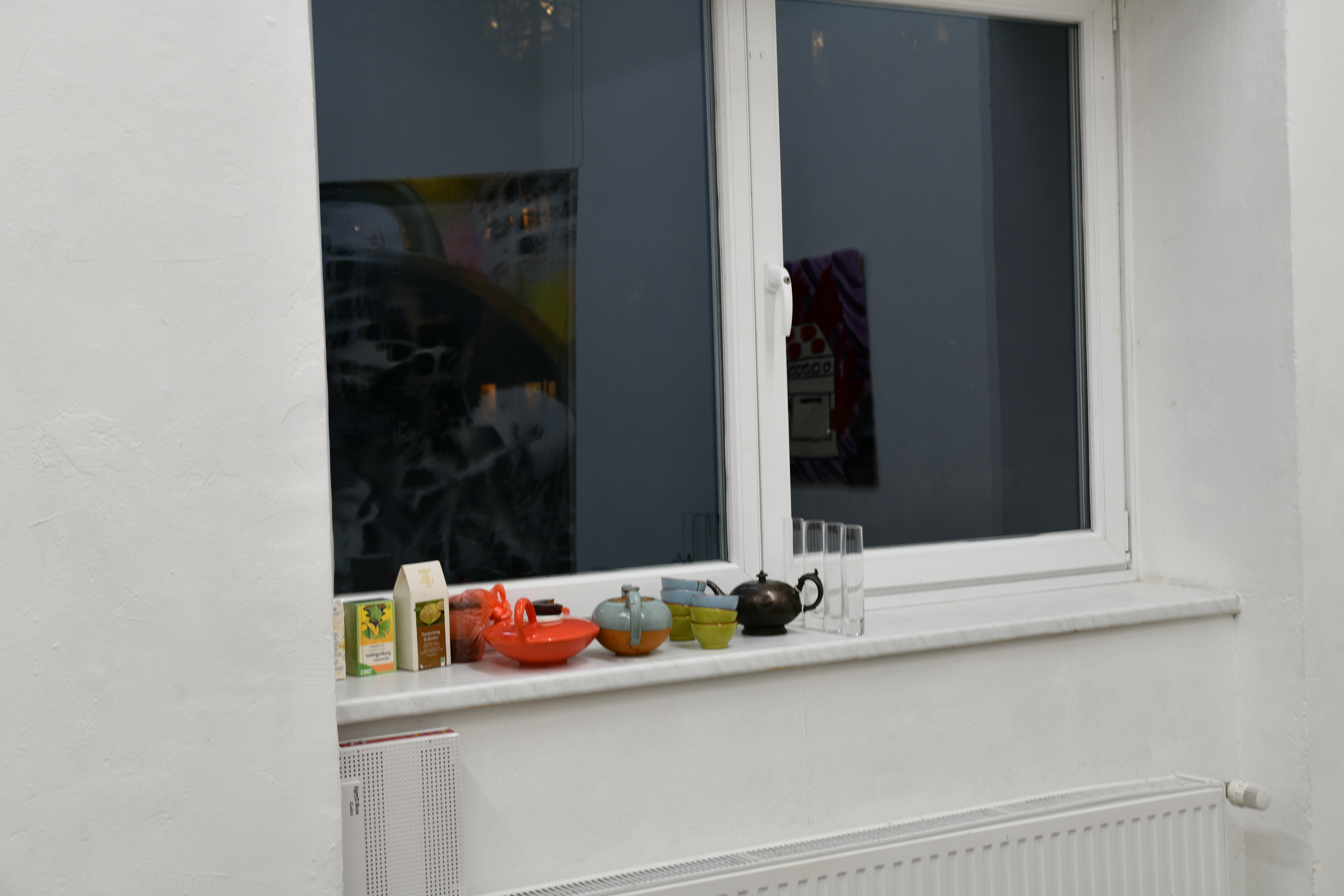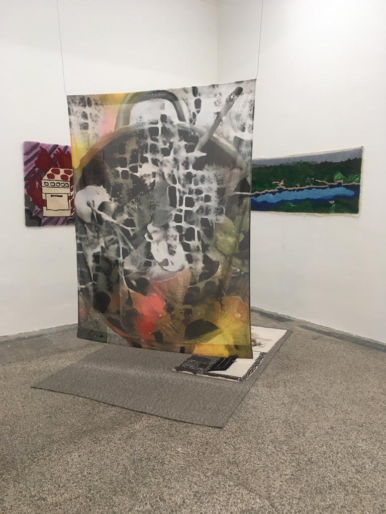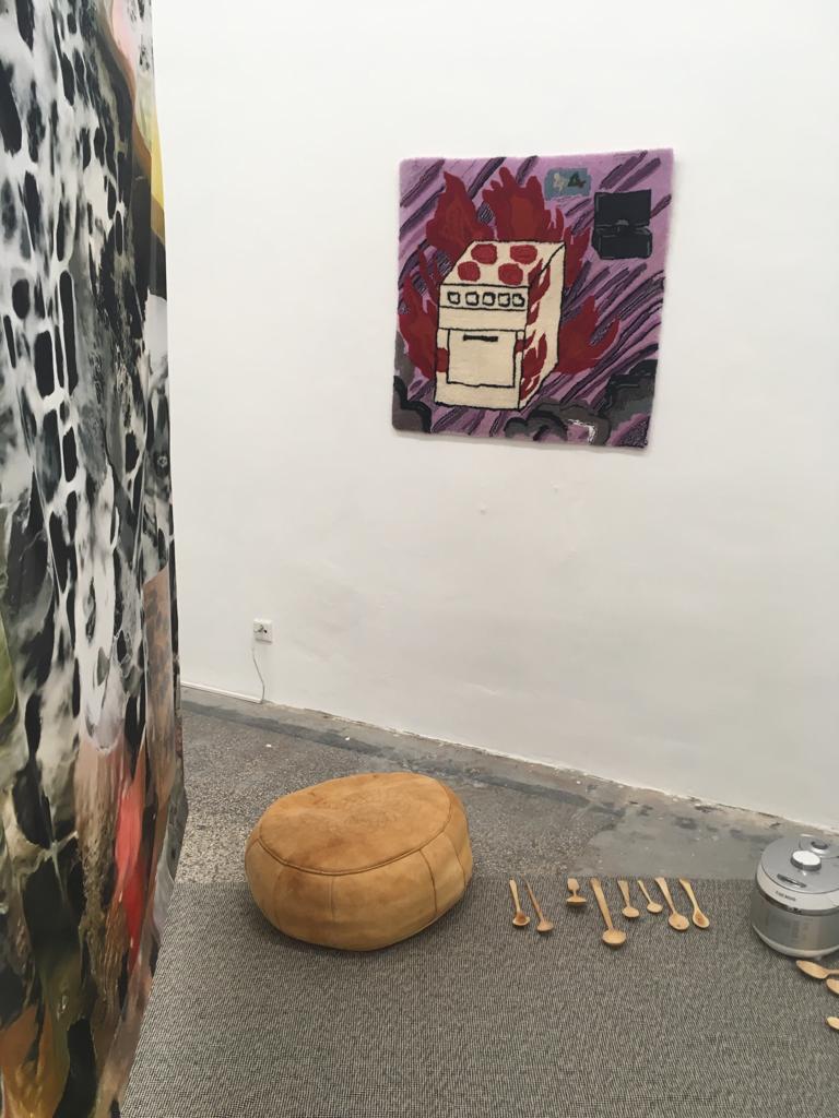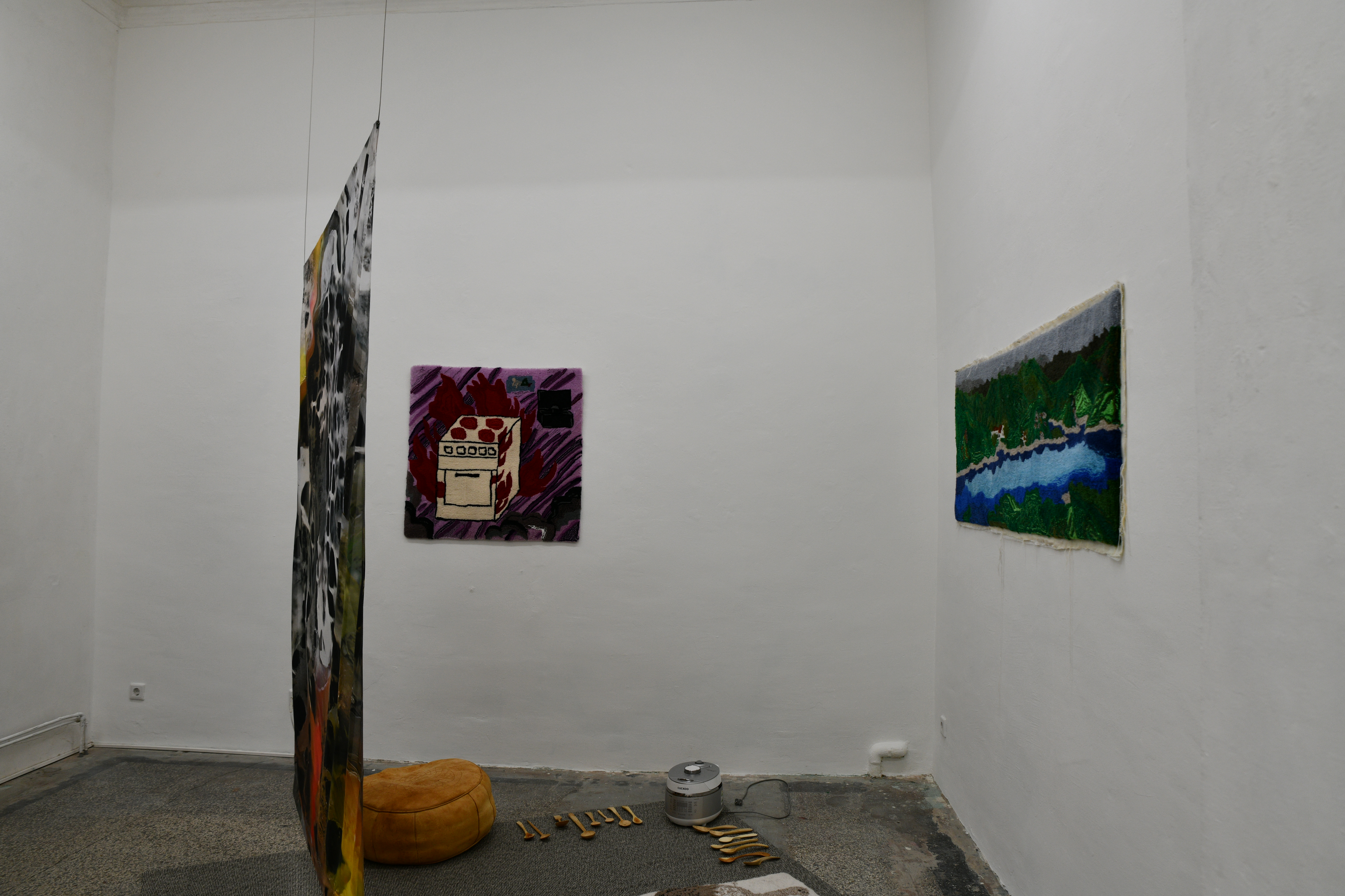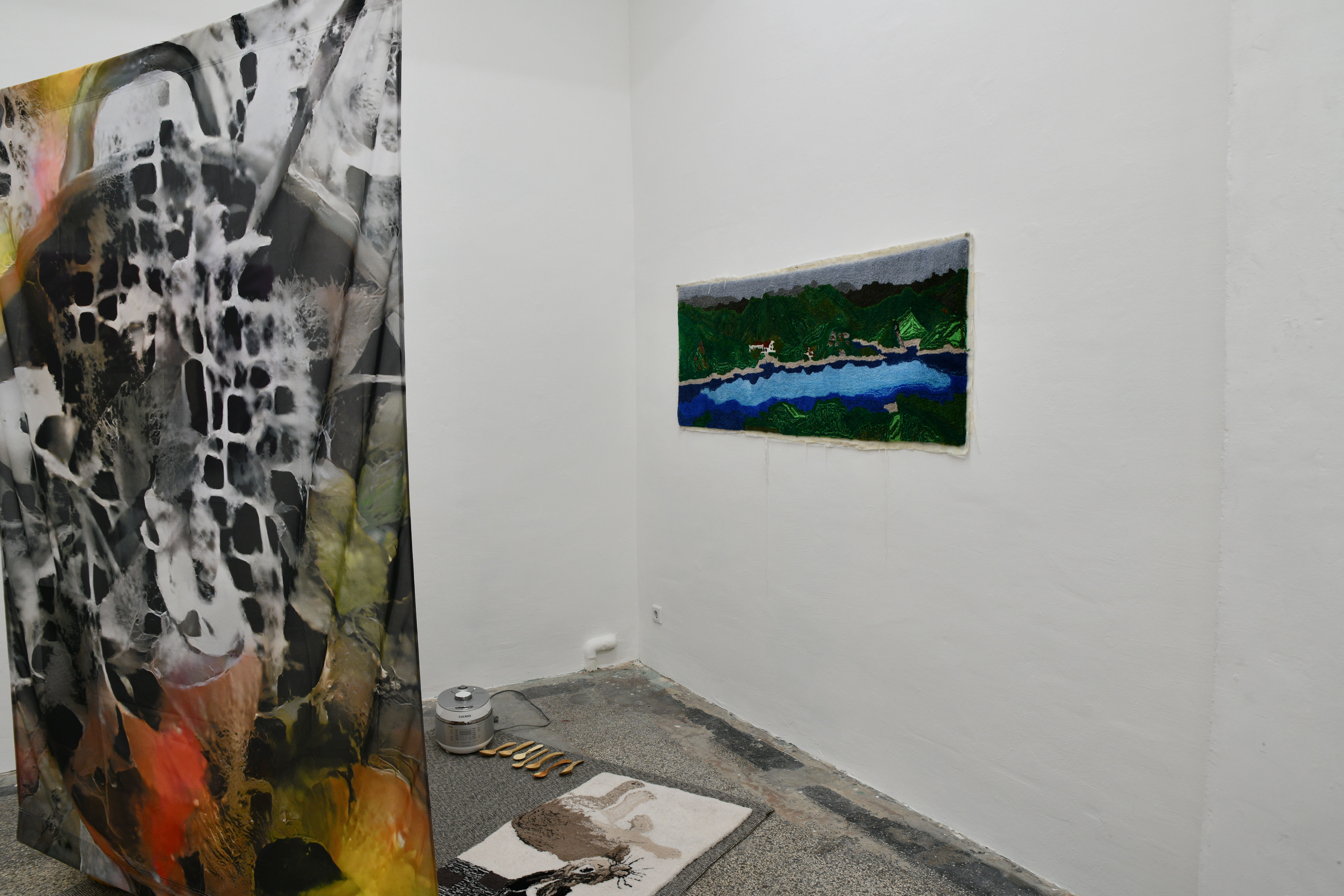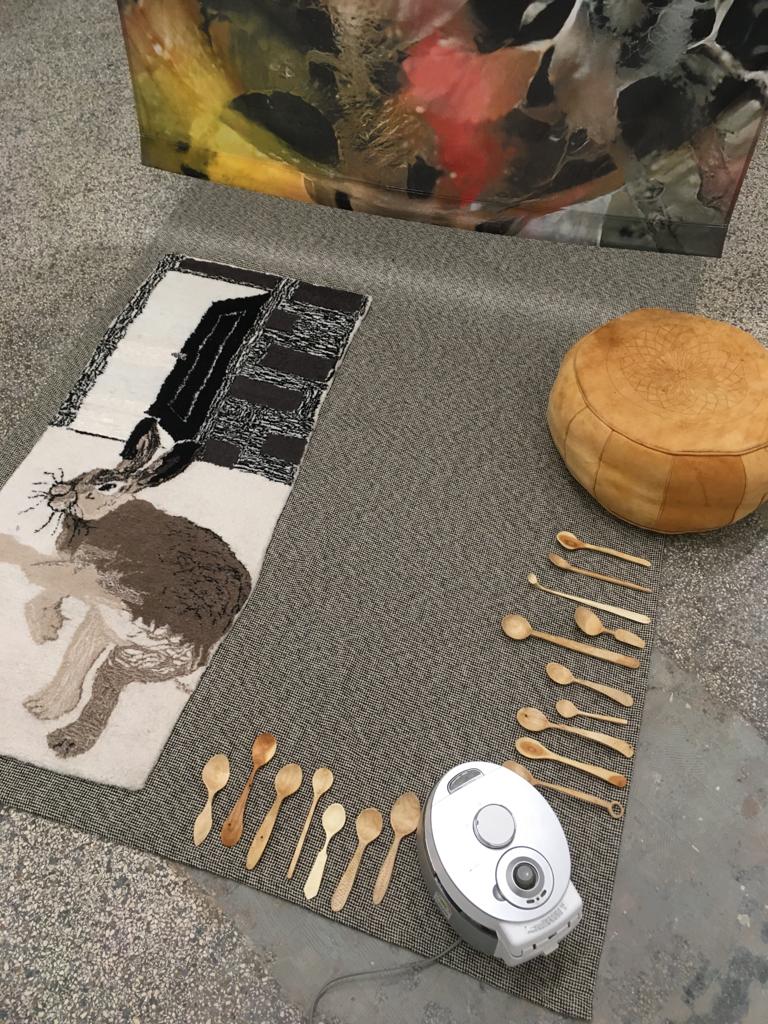 bewusste Kombinatorik nach Geschmackskriterien durchlaufen: Zutaten wurden ausgewählt, geschält, zerstückelt, gegart… Das Kompostieren der Reste zeigt den Prozess der Verinnerlichung im Außen. Verdauung, Kompostieren und Träumen sind Prozesse der Verarbeitung, die Sungeun Claire Choi und ANna Tautfest in der Ausstellung miteinander verbinden. Der künstlerische Produktionsprozess fügt eine weitere Komponente des Verbindens und Zersetzen hinzu. Den unverständlichen oder unsichtbaren Einschreibungen entsprechen hier die Algorithmen Künstlicher Intelligenz, die in die Bildgebung eingreifen. Das ziehen von Fäden wiederum bringt die flüchtigen Traumbilder in Teppichen zusammen. Den Einverleibungsprozess fügen wir im Raum live hinzu. Die Zutaten werden mit handgeschnitzten Holzlöffeln von Markus Hüppauf kredenzt.