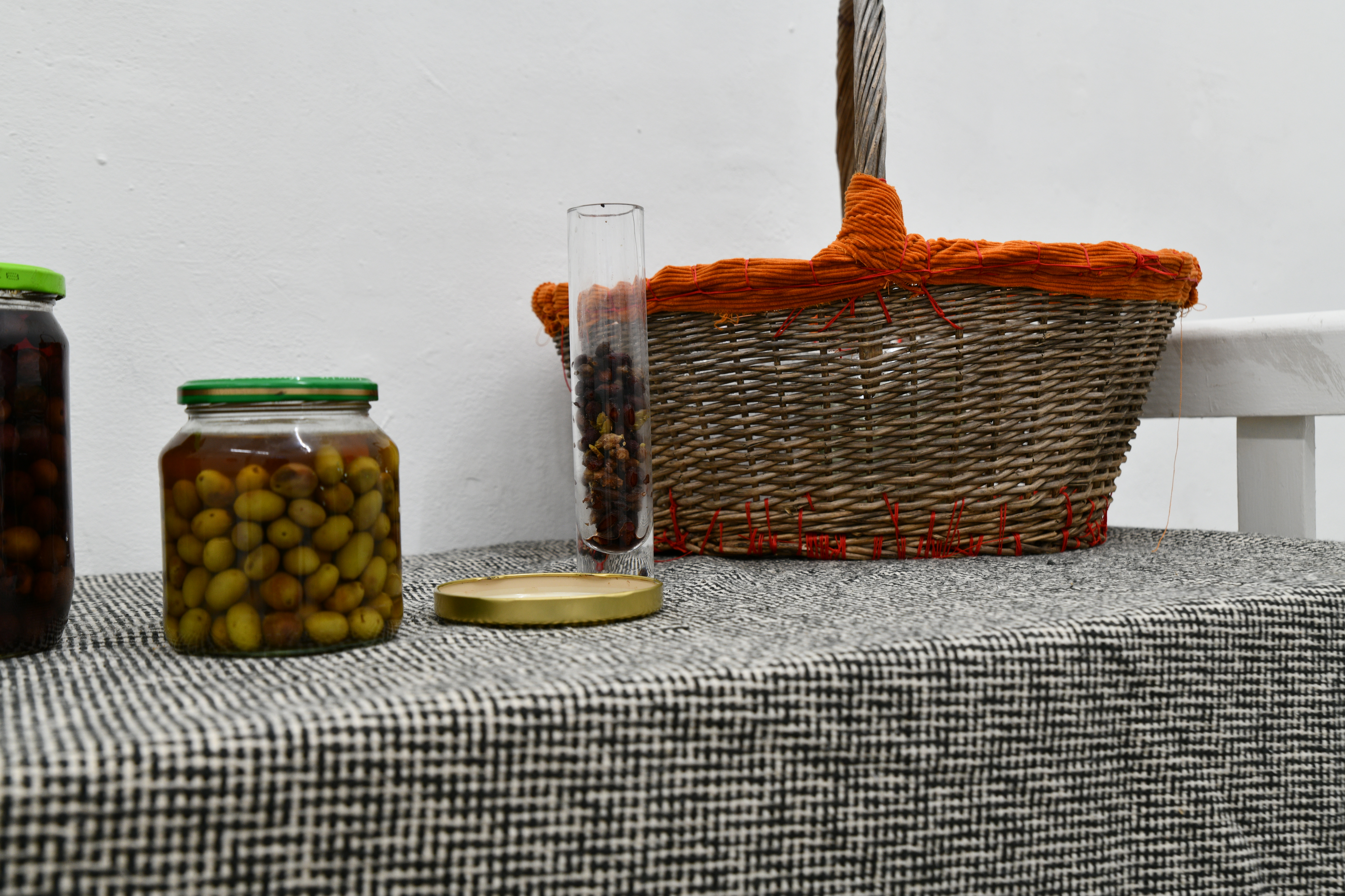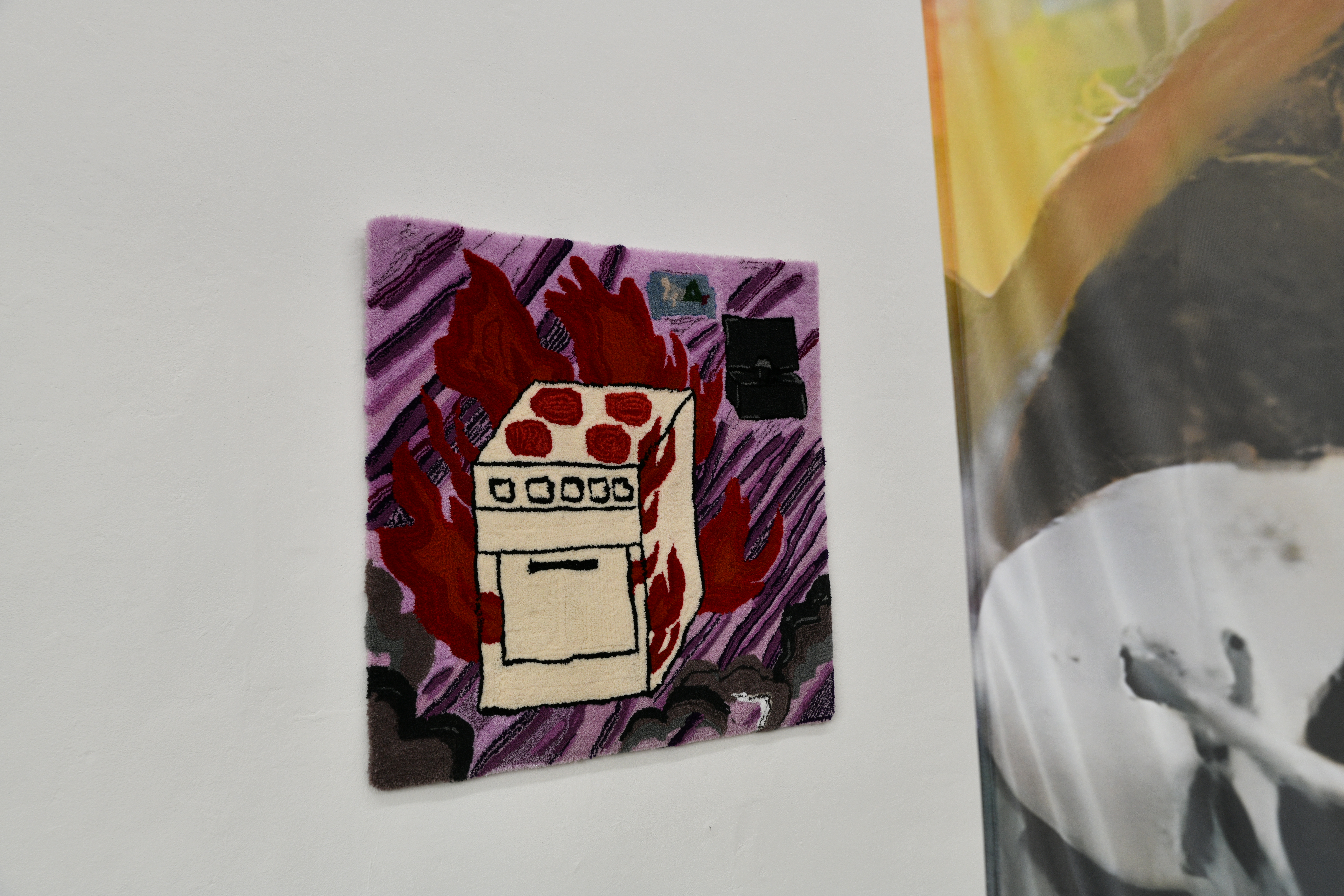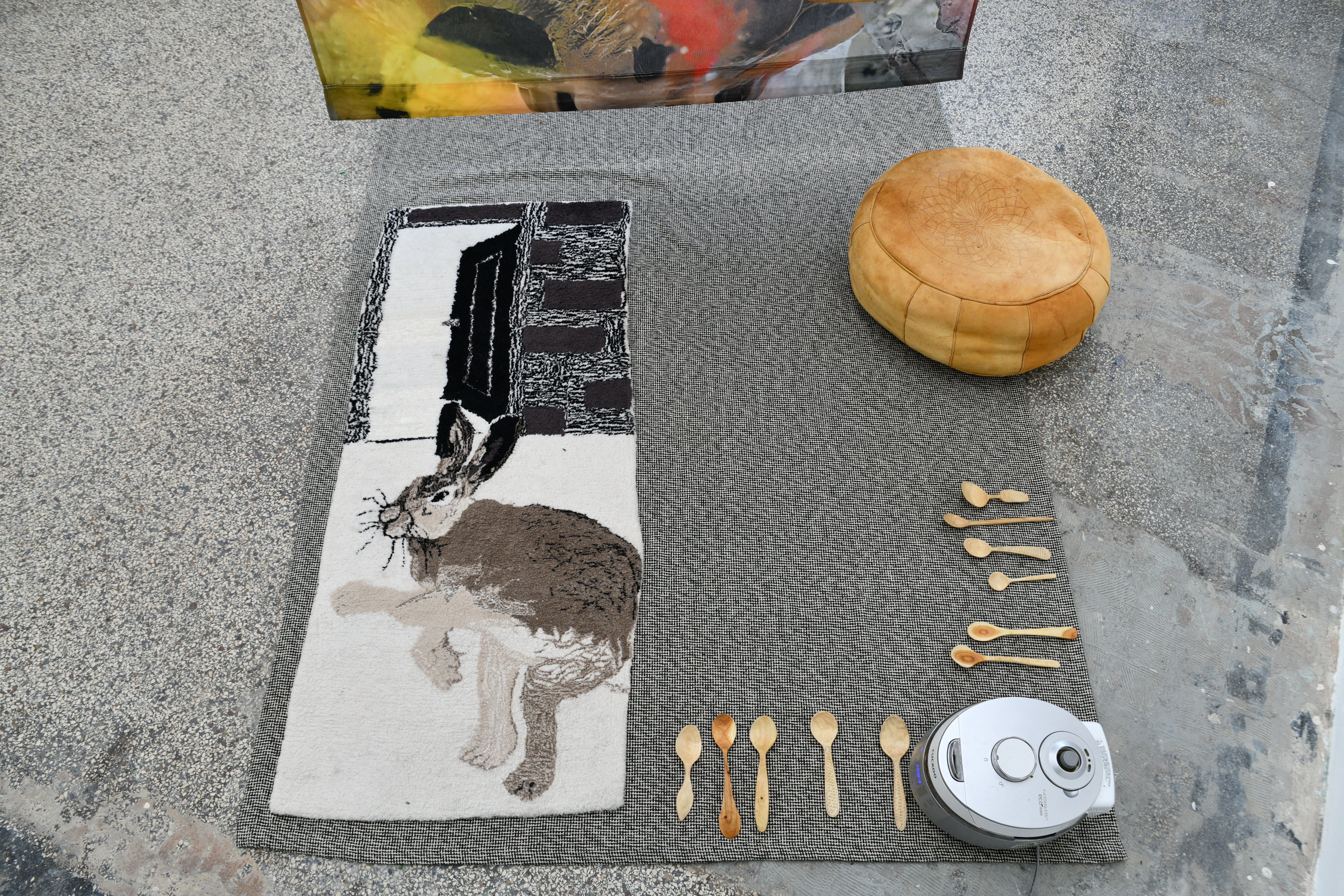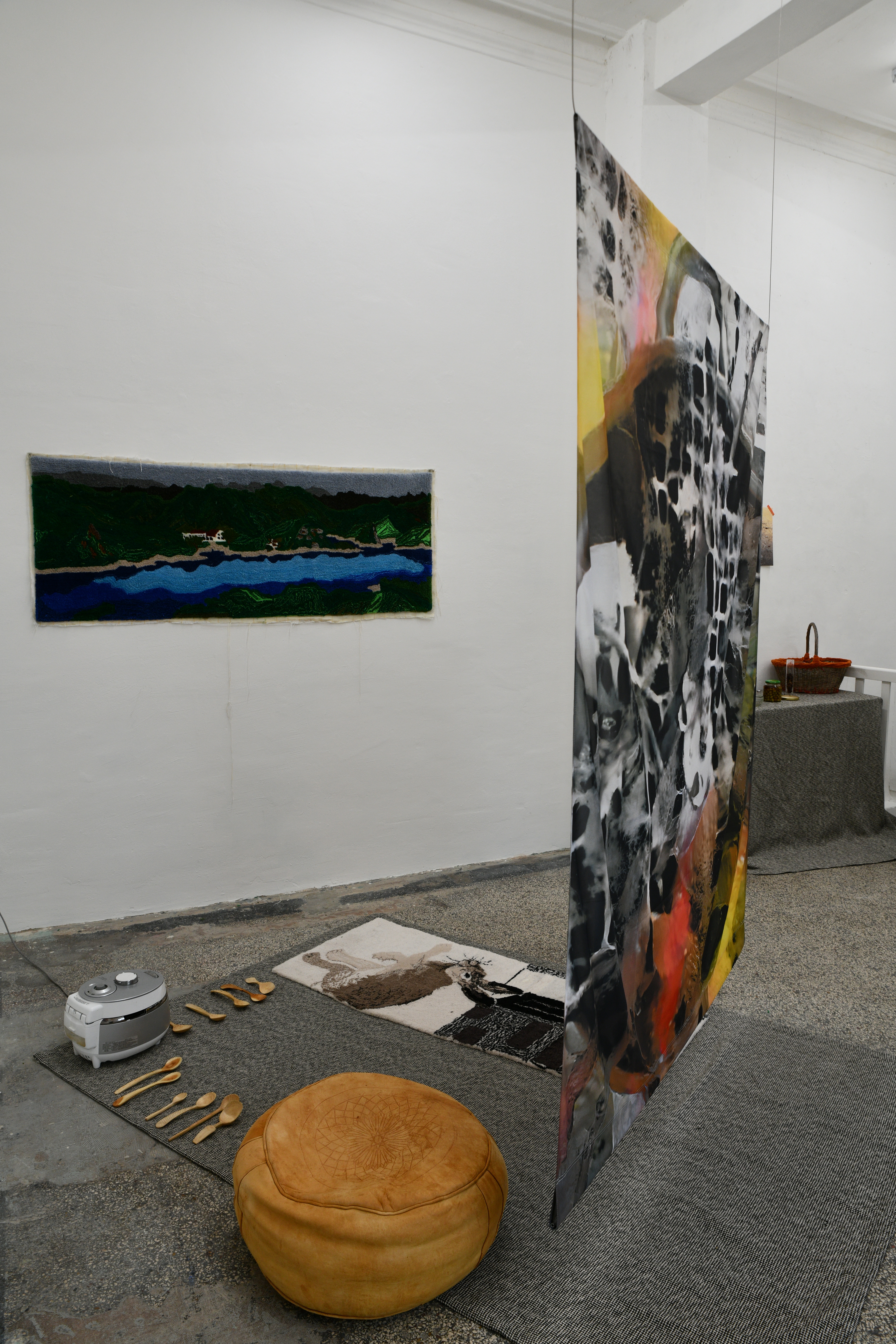 The body as a passage apparatus: a living composter of events and meals. Dreams replay our experiences and thoughts in a mode whose combinatorics remain hidden from us. The logic by which they interpenetrate is beyond our comprehension. We can only follow the output and weave threads into our waking reality. The meals we consume, in turn, have already undergone a conscious combination based on taste criteria: ingredients have been chosen, peeled, diced, cooked… Composting the remains reveals the process of internalization in the external.Digestion, composting, and dreaming are processing procedures that Sungeun Claire Choi and ANna Tautfest connect in the exhibition. The artistic production adds another component of connecting and decomposing. The incomprehensible or invisible inscriptions correspond here to the algorithms of Artificial Intelligence that intervene in the imagery. Pulling threads, in turn, brings the fleeting dream images together in carpets. We add the incorporation process live in the space. The ingredients are served with hand-carved wooden spoons by Markus Hüppauf.
